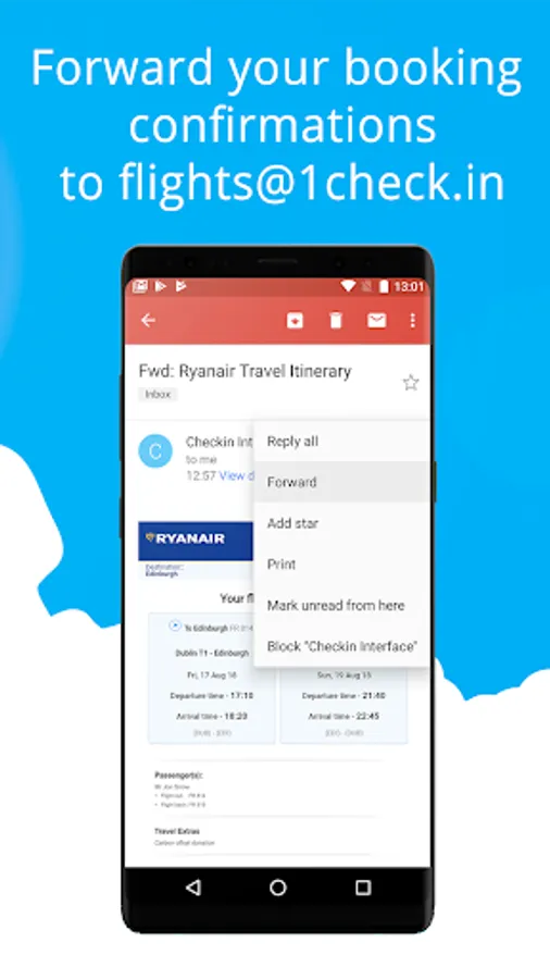 Simply forward your booking confirmations to flights@1check.in, get an overview of all your upcoming flights, and let 1Checkin manage the rest: