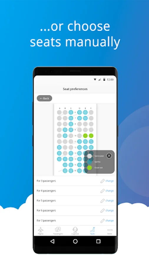 Request and view your upcoming flight’s seat map and select your seat(s). The seat map will include information about paid seats. Link your credit card to your account, so you can conveniently upgrade to your preferred seat without leaving the app!
