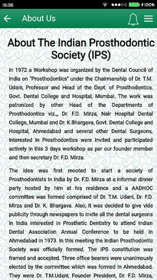 The idea was first mooted to start a society of Prosthodontists in India by Dr. F.D. Mirza at a informal dinner party hosted by him at his residence and a AADHOC committee was formed comprised of Dr. T.M. Udani, Dr. F.D. Mirza and Dr. K. Bhargava. Also, it was decided to give vide publicity through newspapers to invite all the dental surgeons in India interested in Prosthetic Dentistry to attend Indian Dental Association Annual Conference to be held in Ahmedabad in 1973. In this meeting the Indian Prosthodontic Society was officially formed. The IPS constitution was framed and accepted. Three office bearers were unanimously elected by the committee which was formed in Ahmedabad. They were Dr. T.M.Udani, Founder President, Dr. F.D. Mirza, founder Secretary-cum-Treasurer and Dr.K. Bhargava as the Editor of our Journal.