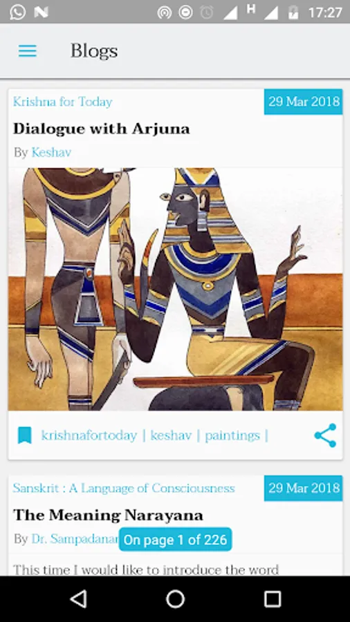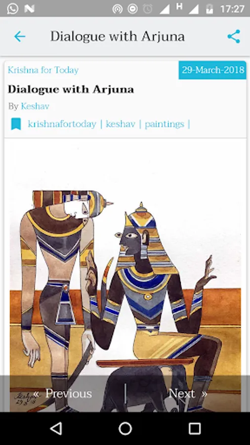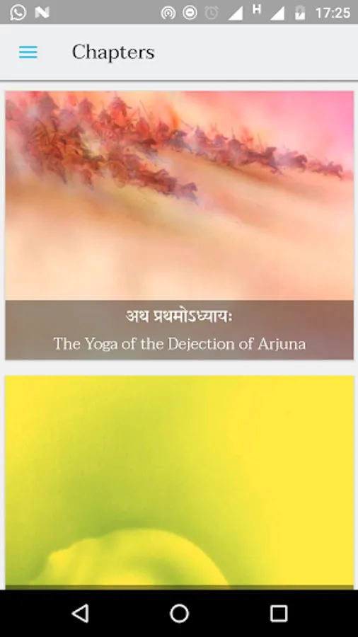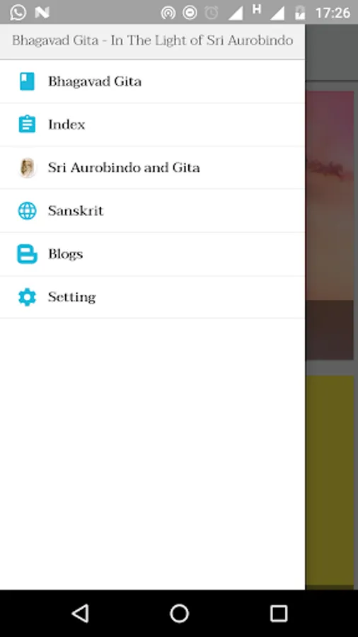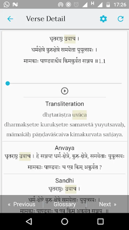 The Apps contains a veriety of material, presented in a manner which is easily accessible: the entire 700 verses of the Bhagavad Gita chapters are in Devanagari with a Roman transliteration, followed by an English translation, (ANVAYA the prose order of the Sanskrit words) and word by word meaning. Each verse has been traditionally chanted to illustrate the sound and beauty of the Sanskrit language. In addition, miscellaneous writings and extensively interlinked indexes give much to the scholar to work with. These includes a Quarter-verse Index, a Subject Index, and a Word Index which lists all the words in the Bhagavad Gita alphabetically along with their grammatical analysis. Hundreds of visuals have been used to give each page its own mood and atmosphere, at times bordering on the sublime. Last but certain not the least, it contains the entire text of Sri Aurobindo’s ‘Essays on the Bhagavad Gita ’. You can also understand Bhagavad Gita in English. Bhagavad Gita essays in english has also been provided.