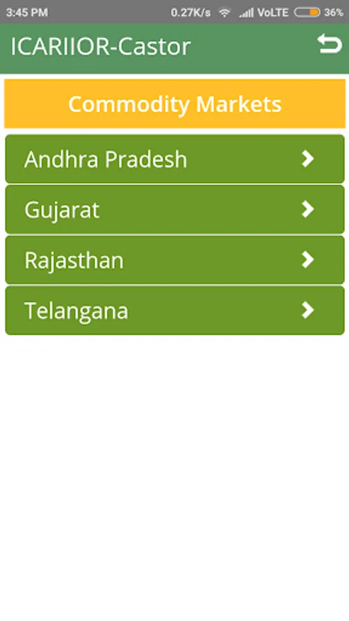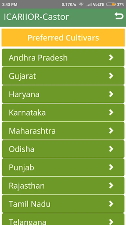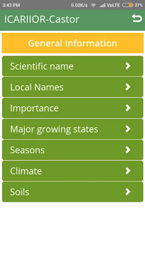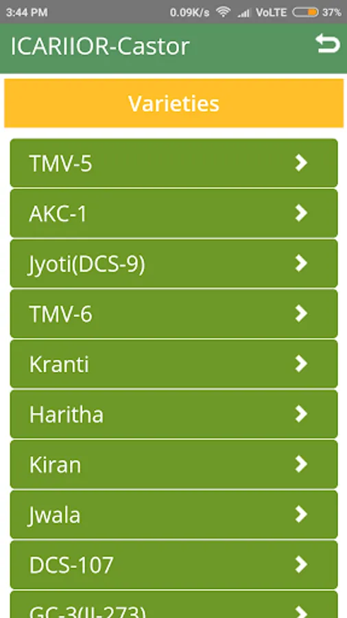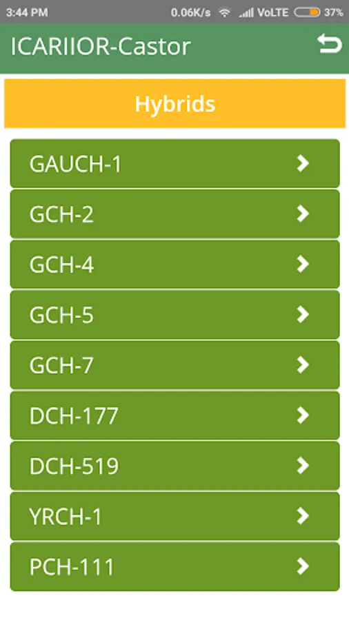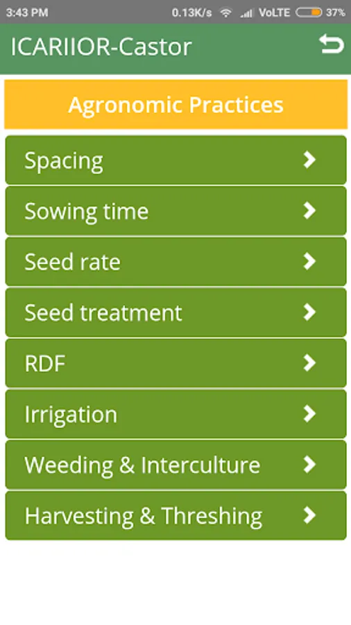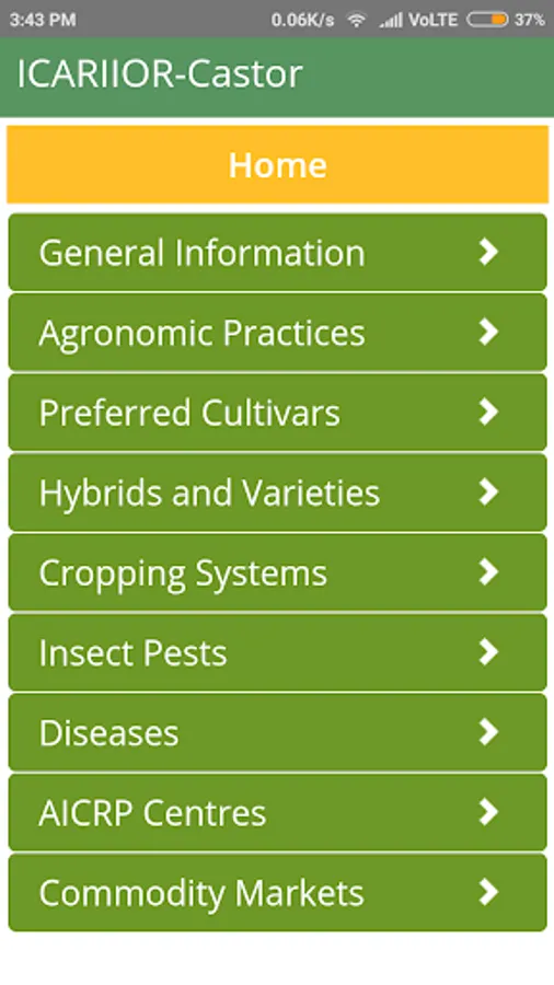 An app on Castor crop. Developed by Indian Institute of Oilseeds Research (ICAR). Includes information on Markets, Agronomic Practices, Hybrids and Varieties, Cropping Systems and Insect Pests