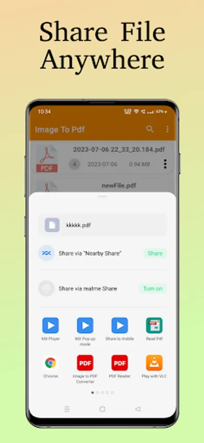 Easily send and share converted PDF files via social media, Bluetooth, Email, quick share, etc.