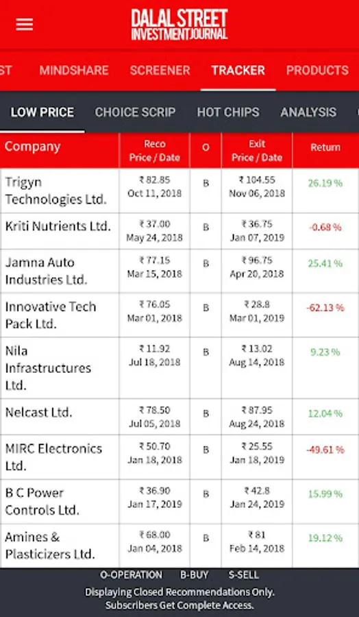 • Call Tracker displays status on stocks recommended in the past 12 months.