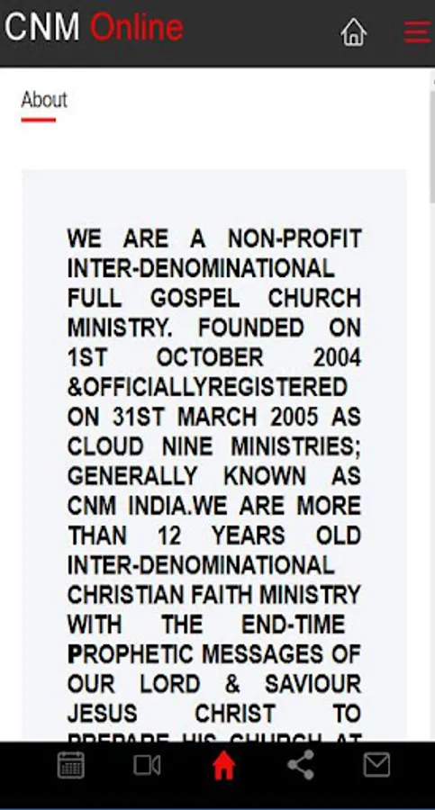 We are a Non-Profit Inter-denominational Full Gospel Church Ministry. Founded on 1st October 2004 &officiallyregistered on 31st March 2005 as Cloud Nine Ministries; generally known as CNM India.We are more than 12 years old inter-denominational Christian faith ministry with the end-time prophetic messages of our Lord & Saviour Jesus Christ to prepare His Church at large.