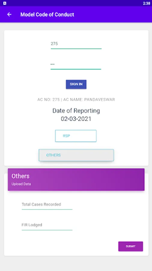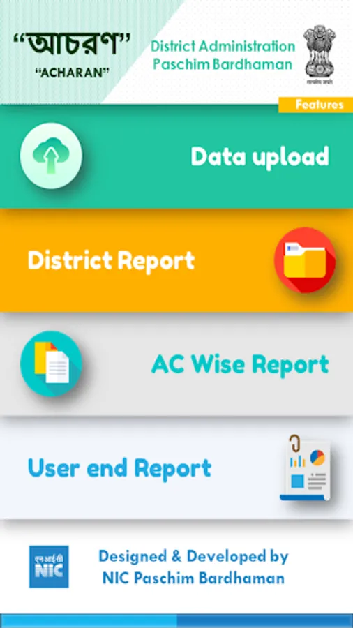 "Acharan" is an initiative of District Magistrate, Paschim Bardhaman, materialized by National Informatics Centre, Paschim Bardhaman. The primary and sole objective of this app is to provide a user-friendly approach to expedite the process of submission of reports in regard to enforcement of Model Code of Conduct and enhance the accessibility of real-time data in web based as well as app based reporting mechanism which would assist the district administration in closely monitoring the developments and keeping track of up-to-date reports in real-time in the jurisdiction of Paschim Bardhaman, in connection with the imminent General Election to West Bengal Legislative Assembly, 2021.