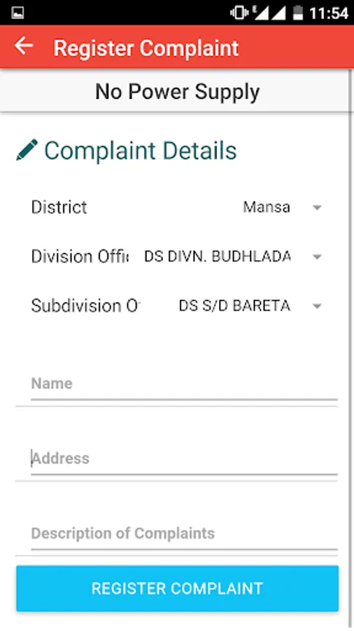 * You can register complaints related to supply, billing etc