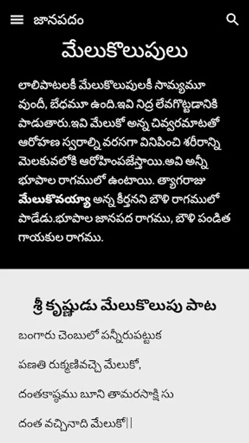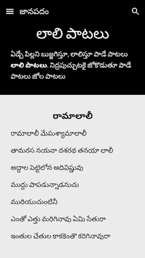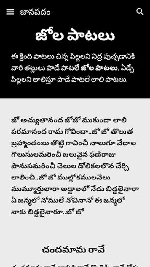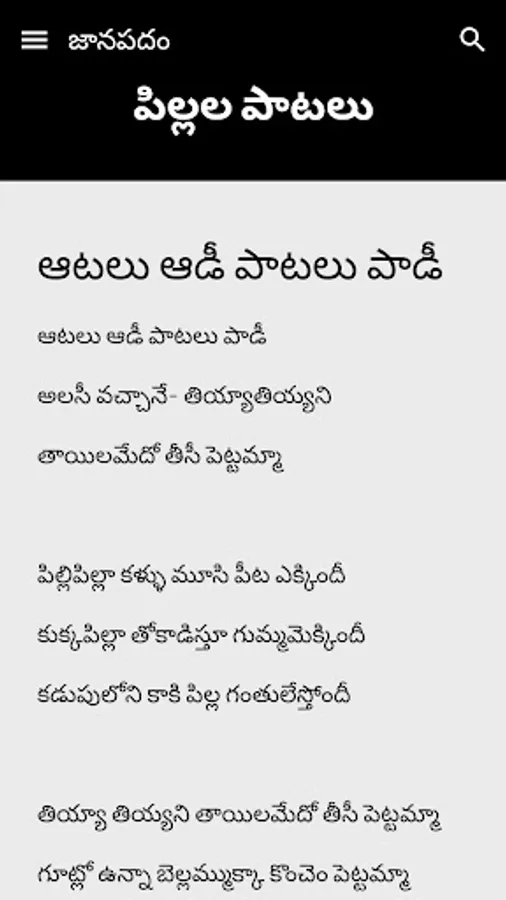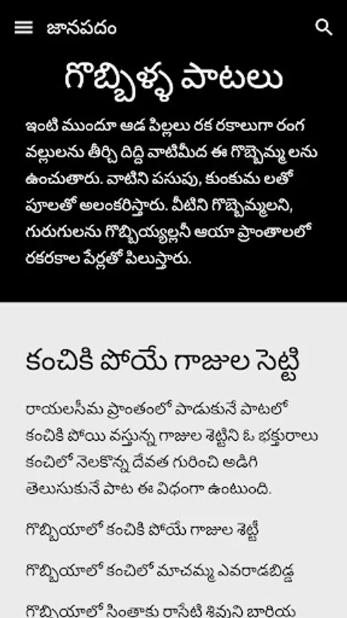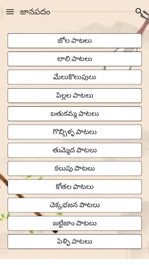 Janapadam Telugu is diverse traditional music with India's vast cultural diversity. Janapada Geethalu Telugu is known for its rich heritage and rural culture. A lovely collection of traditional folk and music. Janapada Geethalu Telugu with their originality, longevity, social impact and poetic values stand as a testimony of rich cultural heritage of both Andhra Pradesh and Telangana states.