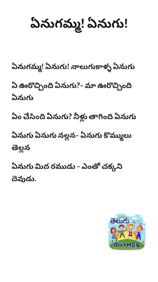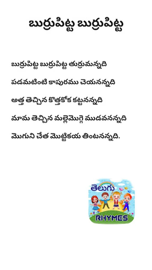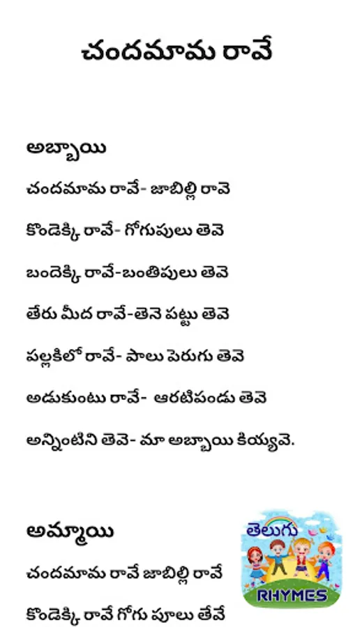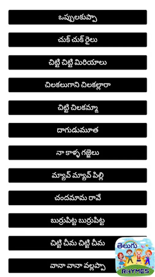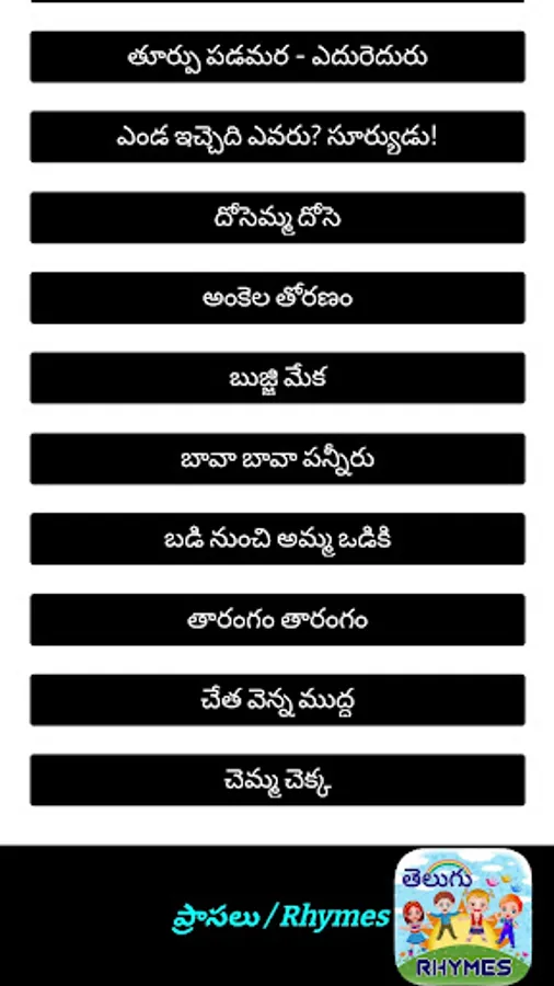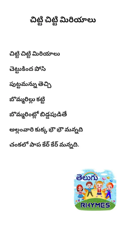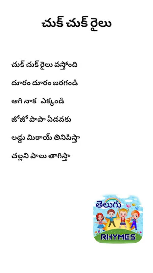 Telugu Rhymes are in Telugu language.All Students can understand all Rhymes and Songs in Telugu in this Application. Some of Telugu Rhymes and songs are collected from their educational books. Usefull for singing song.