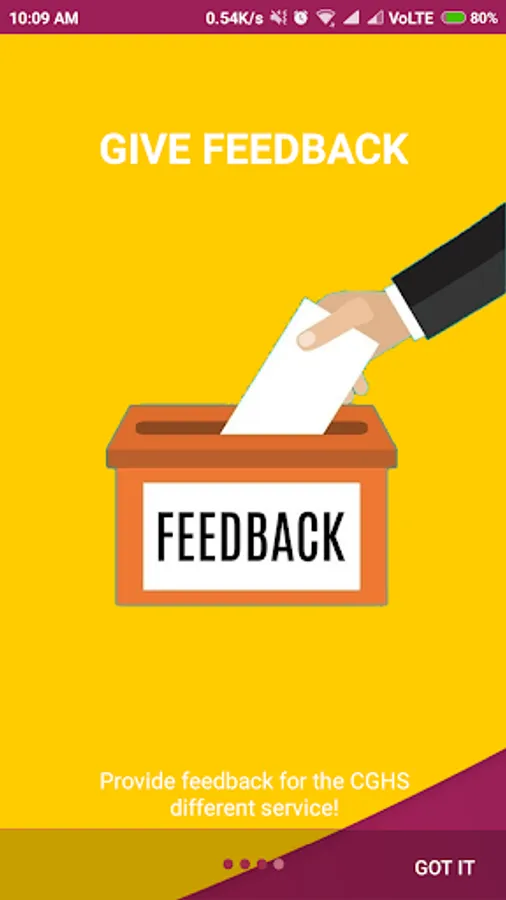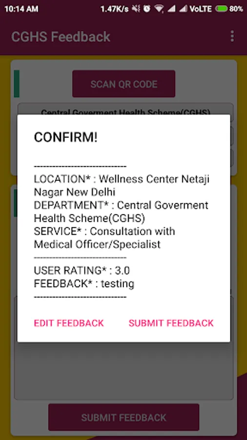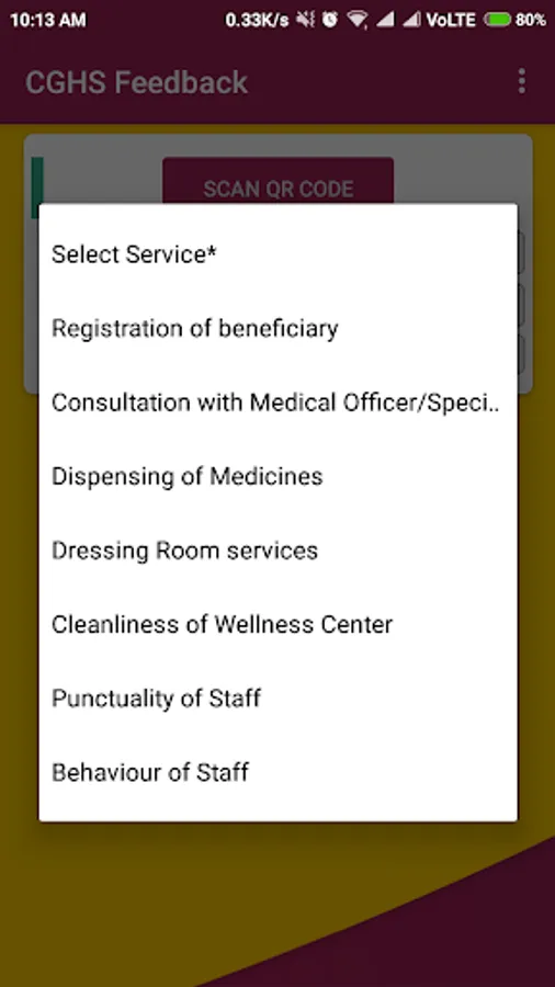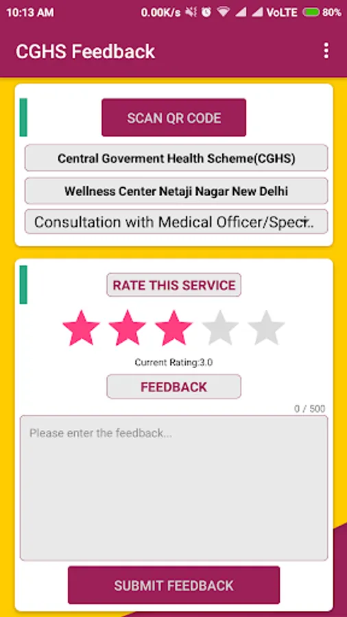 A mobile app has been developed for CGHS beneficiaries to submit their feedback on defined CGHS Services. QR codes will be displayed in the Wellness Centres and CGHS beneficiaries, using mobile app, may scan the QR code and submit their feedback on the defined CGHS services.