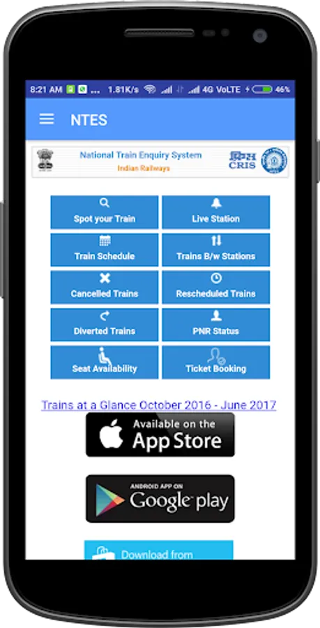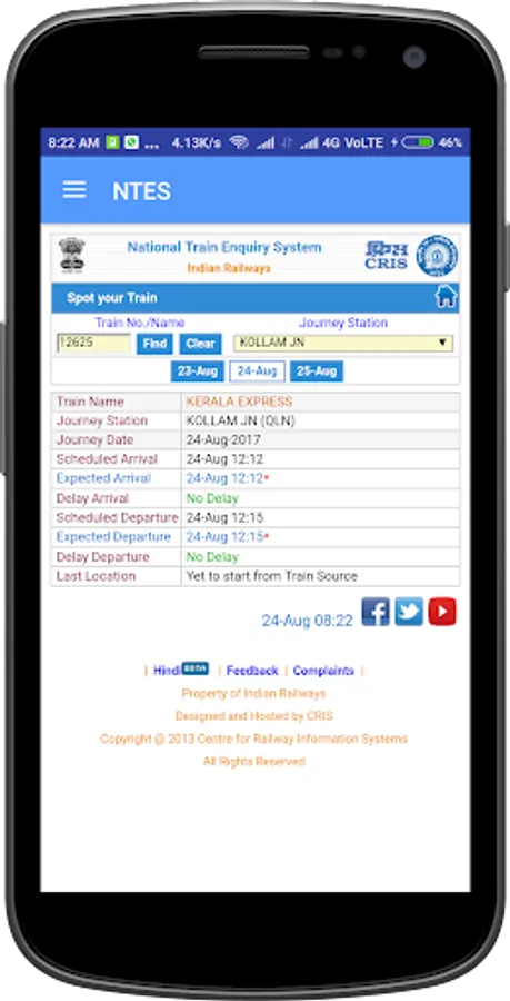 NTES-National Train Enquiry System (Indian Railways) app for travelers using railways for taking holiday vacation trips, official trips, tours, and daily commute. Site provides train-running related and real-time status queries for all trains of India.