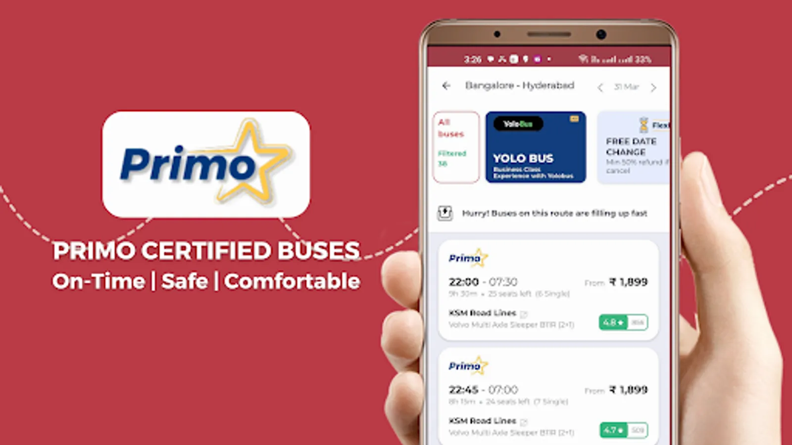 ⭐ Primo Certified Buses: Specially curated by redBus, Primo offers you high-rated buses with best-in-class service i.e. Extra Comfort, Safety, & On-time!