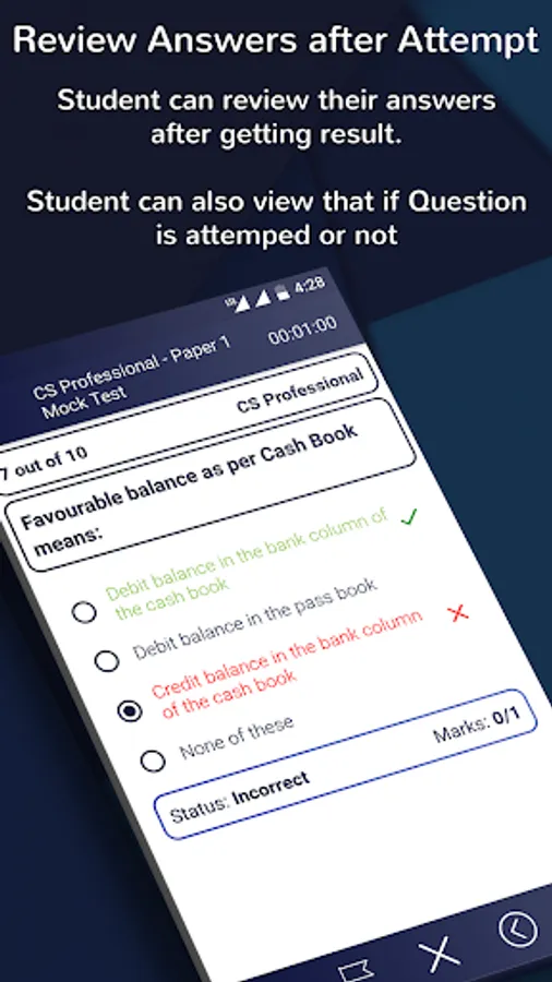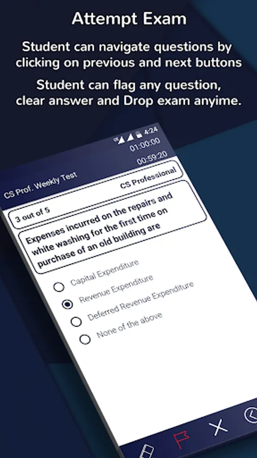 Student can take exam anytime, anywhere from his/her app. Student can flag any questions which he want to mark, also he/she can navigate to any questions from exam.