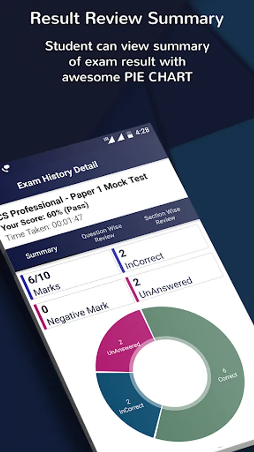 Student can see his/her exam result summary which will show you Result (Pass/Fail), Obtained Score, PIE CHART to know attempted/not attempted, correct and incorrect no. of questions.