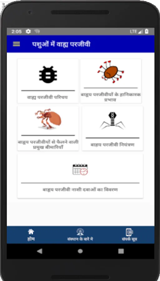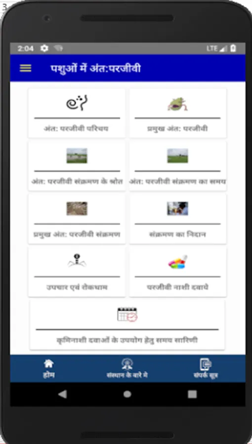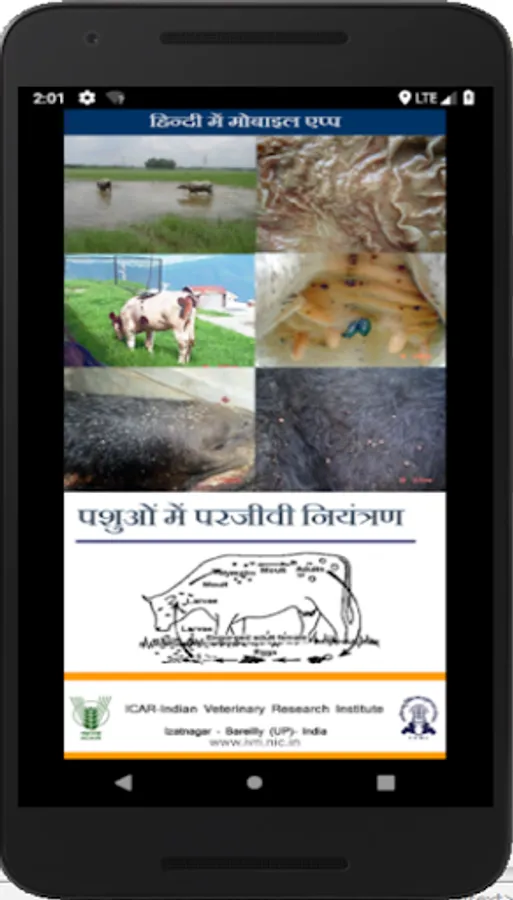 The Mobile App “Pashuon me Parjeevi Niyantran” has been developed in “Hindi language” by the team of Scientists/ Subject Matter Specialist of Indian Veterinary Research Institute- Izatnagar. This App will provide basic knowledge and create awareness on the various aspects of parasitic diseases infecting/infesting large ruminants in India. Target groups of this “Mobile App” are different stakeholder’s viz. livestock owners, progressive farmers and dairy entrepreneurs, besides graduating veterinary students and field veterinary officers for whom it will be a ready reckoner in diagnosis, treatment and control of parasitic diseases. Aspects covered in the App includes a brief account on both internal and external parasites, their broad types, life cycle requirement, source of infection to the animals, course of disease per se, major symptoms, diagnosis, treatment and control along with very specific comments, if any for the particular drug. The original pictures incorporated for specific diseases will be proved beneficial to the Veterinary Officers colleagues, in correlating their observations recorded while working with an animal. Besides, a suitable deworming schedule has been also included in the App to suit animals of almost all agro-climatic zones of India. This application will work for android API version 15 to 27 i.e. it can work properly for Android Jelly Bean user to Android Oreo users.
