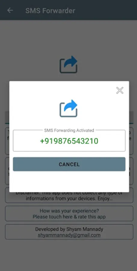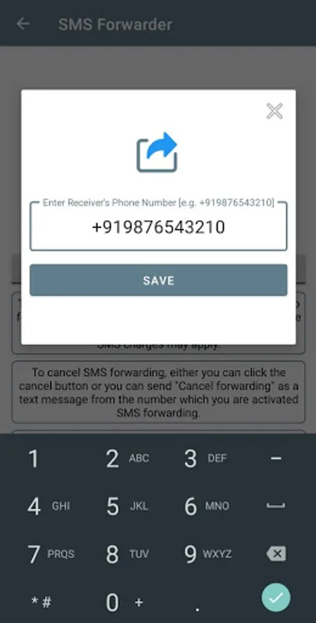 To cancel SMS forwarding, either you can click the cancel button or you can send "Cancel forwarding" as a text message from the number which you are activated SMS forwarding.