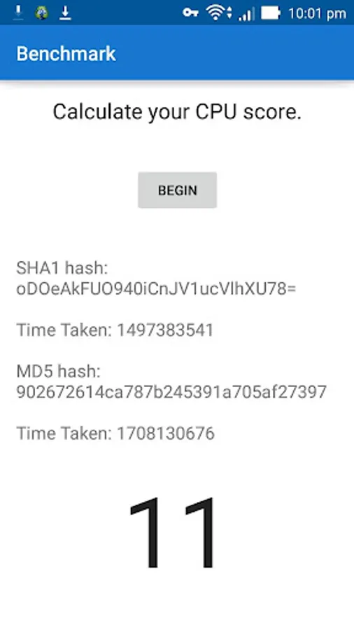 Benchmark calculates raw performance of CPU by calculating hash of a predetermined string several times.