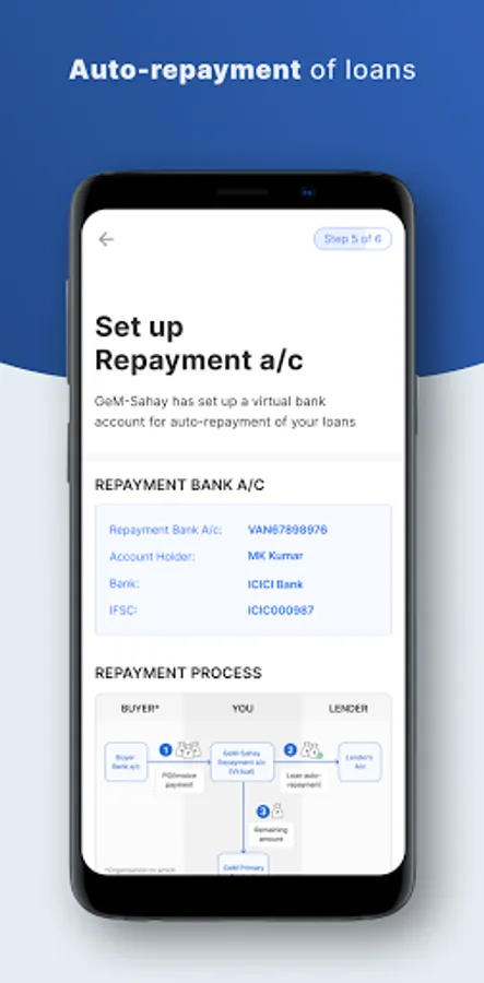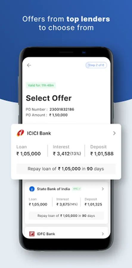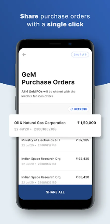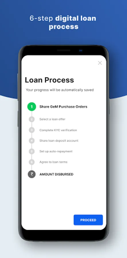 The GeM Sahay mobile application enables you to apply for and avail short term financing offered by Banks and NBFCs such as Kotak Mahindra Bank, UGRO Capital, 121 Finance on the Purchase Orders that you receive on the GeM portal. This program has participation from some of the top lenders in the country. Lenders offer terms with interest rates from 12% to 20% per annum (based on your credit profile), with tenures ranging from 60 to 120 days and upto 90% of the Purchase Order value. The application process is entirely digital and if approved by the lender, the loan will be disbursed in as quickly as 10 minutes.