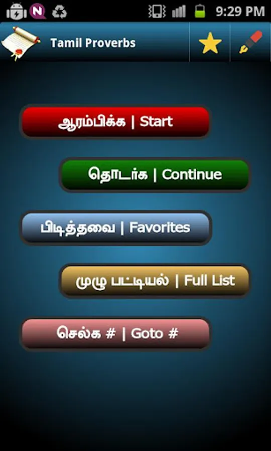 This app is a store-house of immense wisdom and knowledge passed down from generation to generation. Tamil proverbs are usually told to express great philosophy, advice and experiences. Few of the popular proverbs are provided with this app.