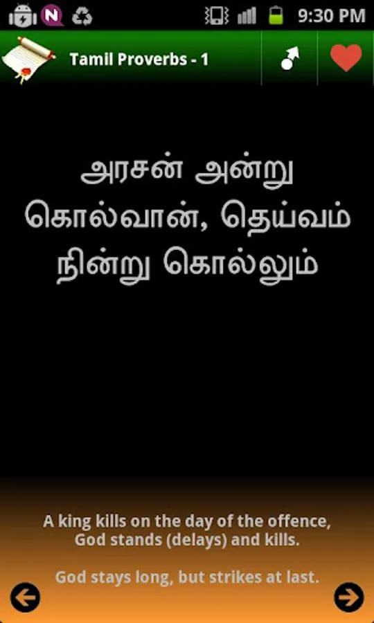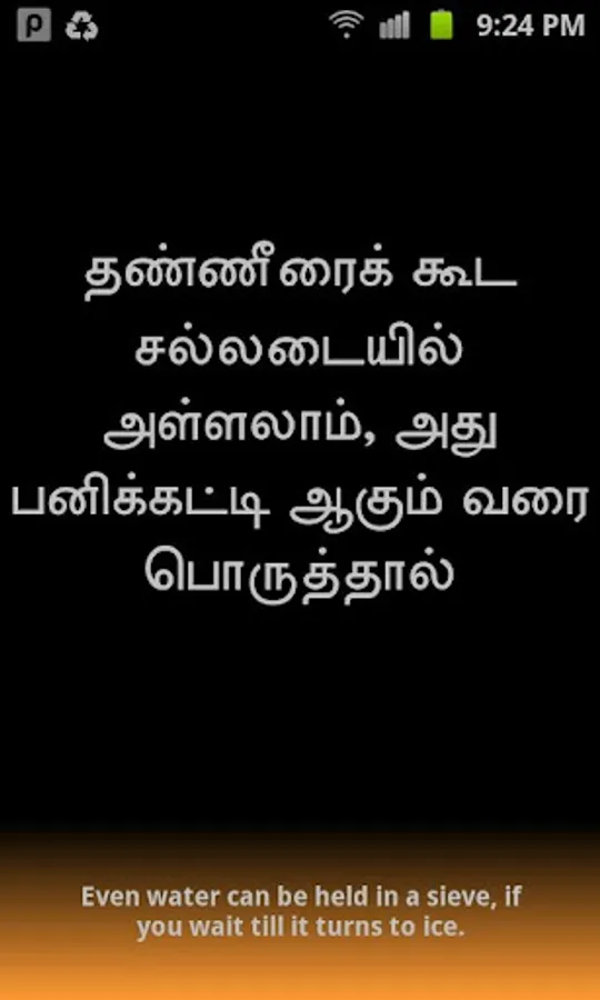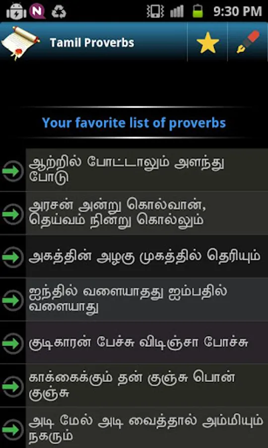 Tamil Proverbs a simple Android application contains commonly used Tamil proverbs popularly defined as short expressions of popular wisdom. The wisdom is in the form of a general observation about the world or a bit of advice, sometimes more nearly an attitude toward a situation.