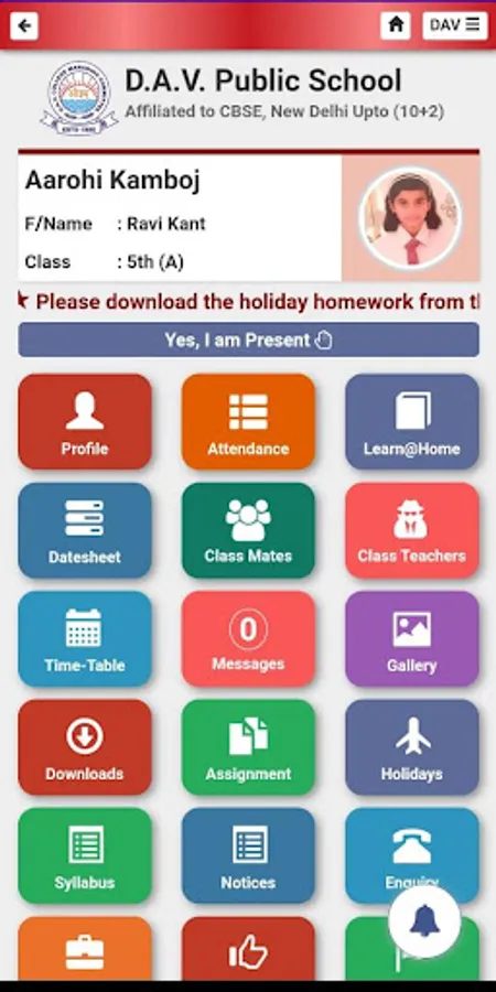 The parent can view attendance, homework, notices, personal message, photo gallery, holiday list, date-sheet, and PTM list, etc. from anywhere and any time.