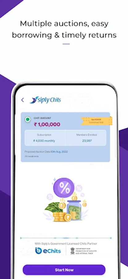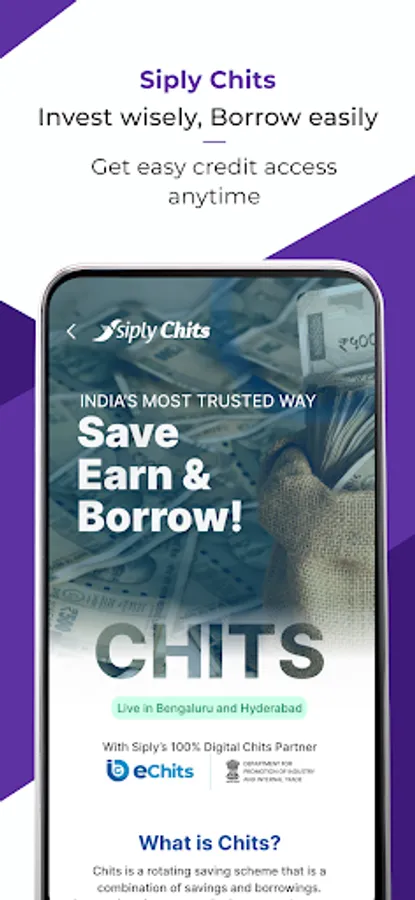 Siply Chits is the digital form of the traditional chits currently LIVE IN BENGALURU & HYDERABAD. It comes in partnership with IBG echits which is the government licensed chit fund. Now you can start by investing as low as Rs.1000/month and earn good returns.