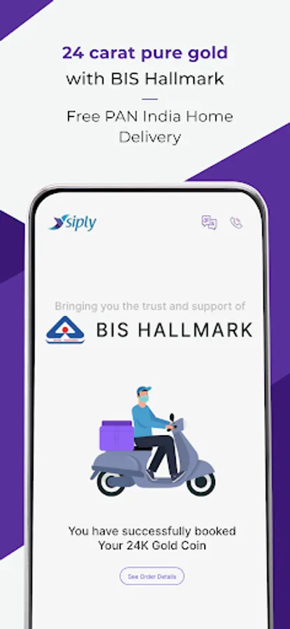 Whenever you buy digital gold on Siply app, an equal amount of gold is purchased on your behalf and is secured in a locker secured by IDBI Trusteeship. The gold you purchase is 24 karat pure and comes with a BIS Hallmark along with a purity certificate.