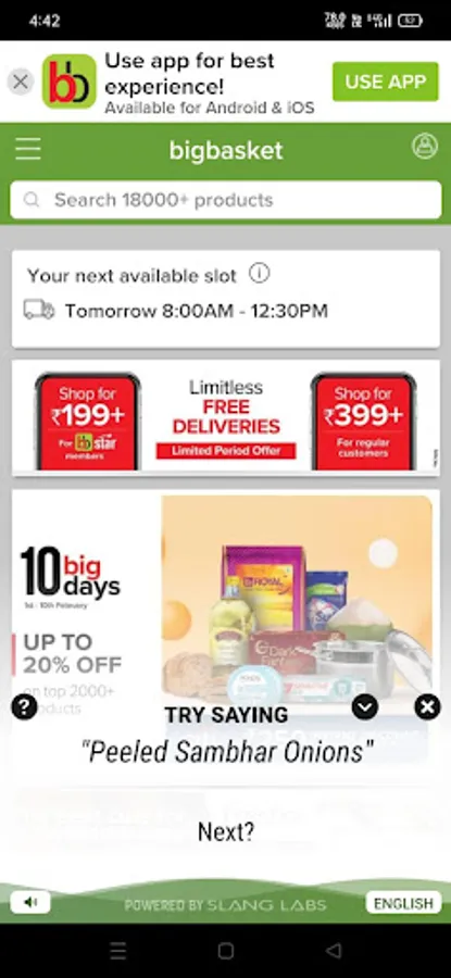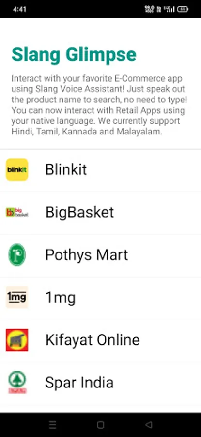 Interact with your favourite E-Commerce app using Slang Voice Assistant! Just speak out the product name to search, no need to type! You can now interact with Retail Apps using your native language. We currently support Hindi, Tamil, Kannada and Malayalam.