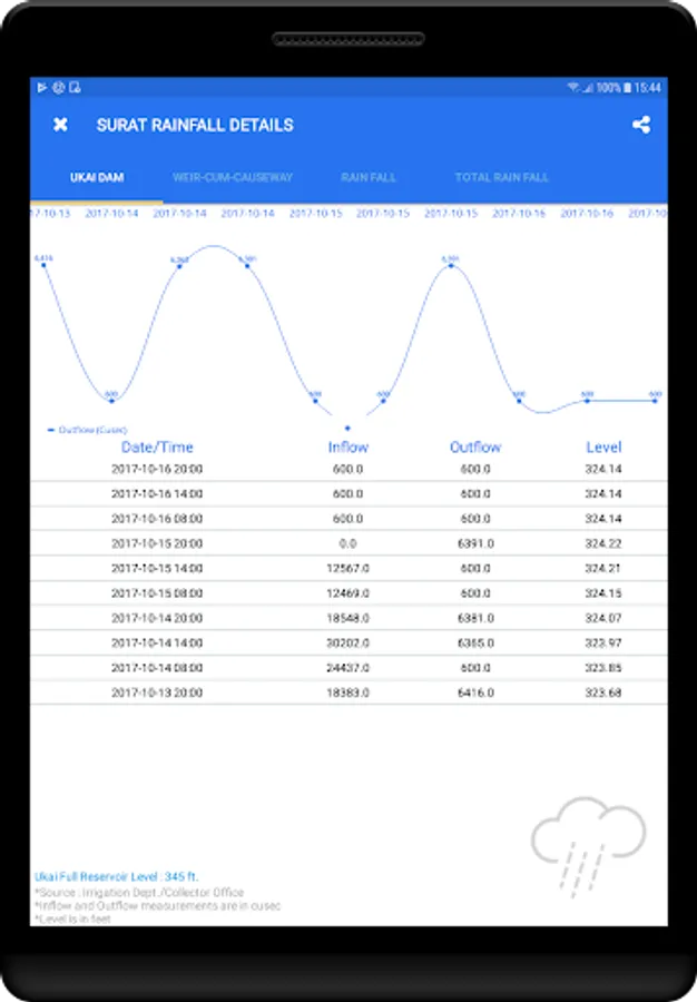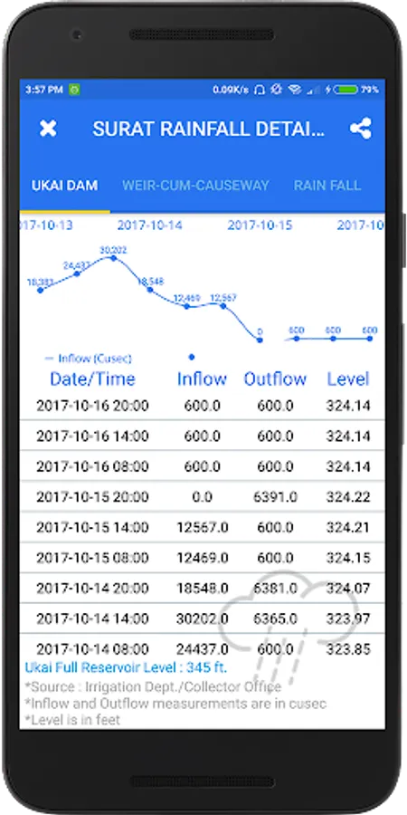 • Rainfall information (details of Ukai dam level, estimated inflow and discharge, status of weir-cum-causeway etc. during monsoon)