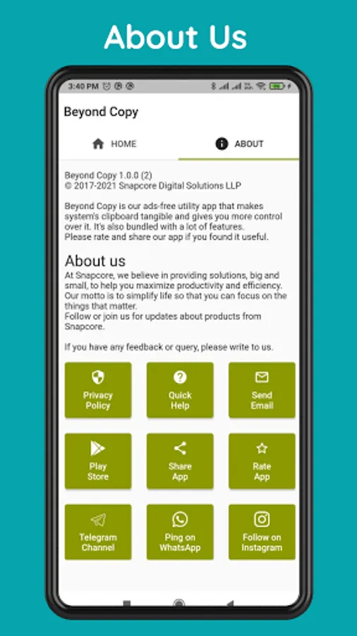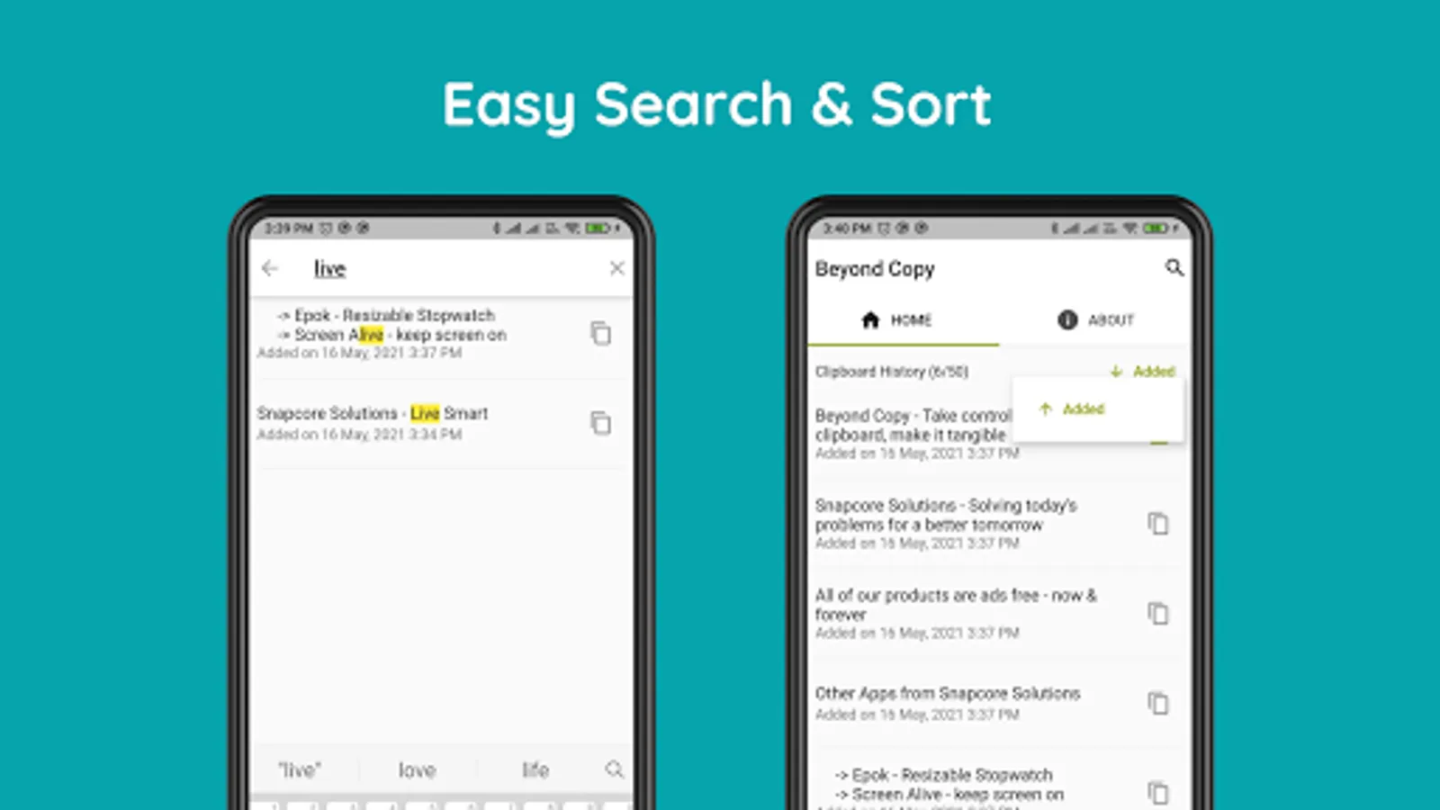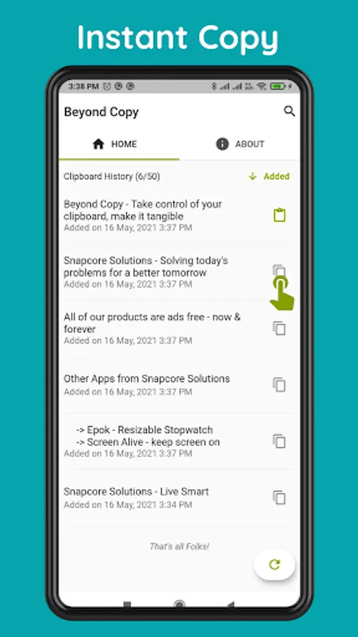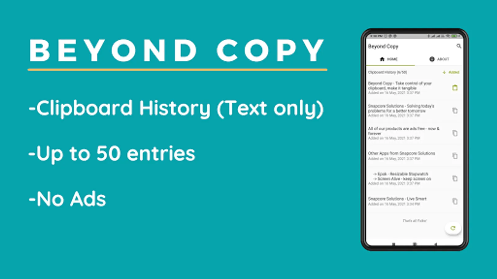 Beyond Copy helps you to keep a history of text that has been copied to the clipboard, supporting up to 50 entries. Find what you want quickly with search and sort options. When needed, copy it back to the clipboard with just one click. Delete unwanted entries when you don't need them anymore.