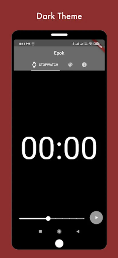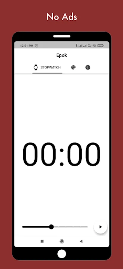 The app is a simple stopwatch which allows easy adjustment of font sizes. It can be displayed with available themes and contains No Ads.