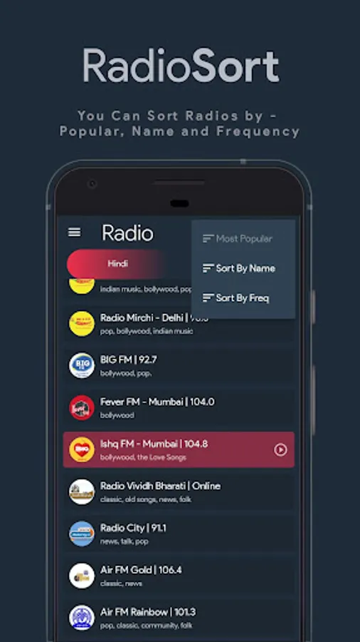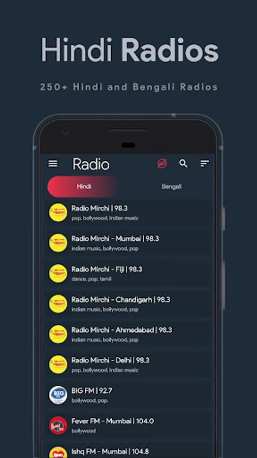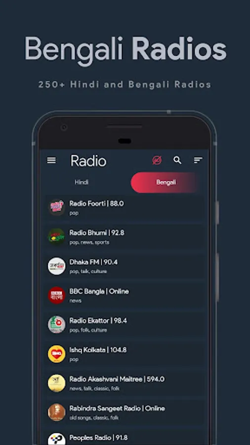 Bengali and Hindi Radio with more than 250 radio channels from all over India and Bangladesh with beautiful material dark design.