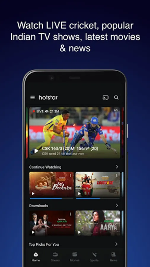 Hotstar is your go-to video streaming app for the best of LIVE cricket, Hindi & Regional Movies, Indian entertainment, TV shows and news. Enjoy unlimited access to non-stop LIVE cricket, blockbuster movies, exclusive Hotstar Specials from India’s best filmmakers and storytellers, your favorite Star India TV shows and LIVE news in multiple Indian languages.