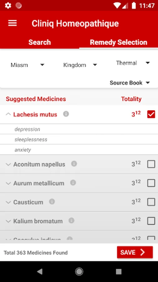 This app also allows you to form a Repertorial Totality by adding multiple symptoms of the patient using the “Remedy selection” tab and displays a chart of medicines with gradation; which covers those symptoms.