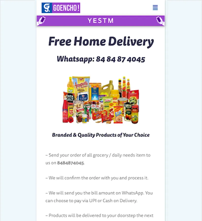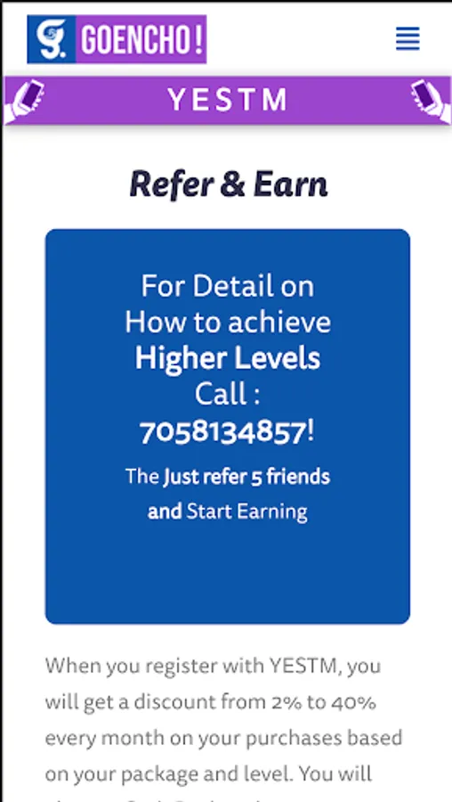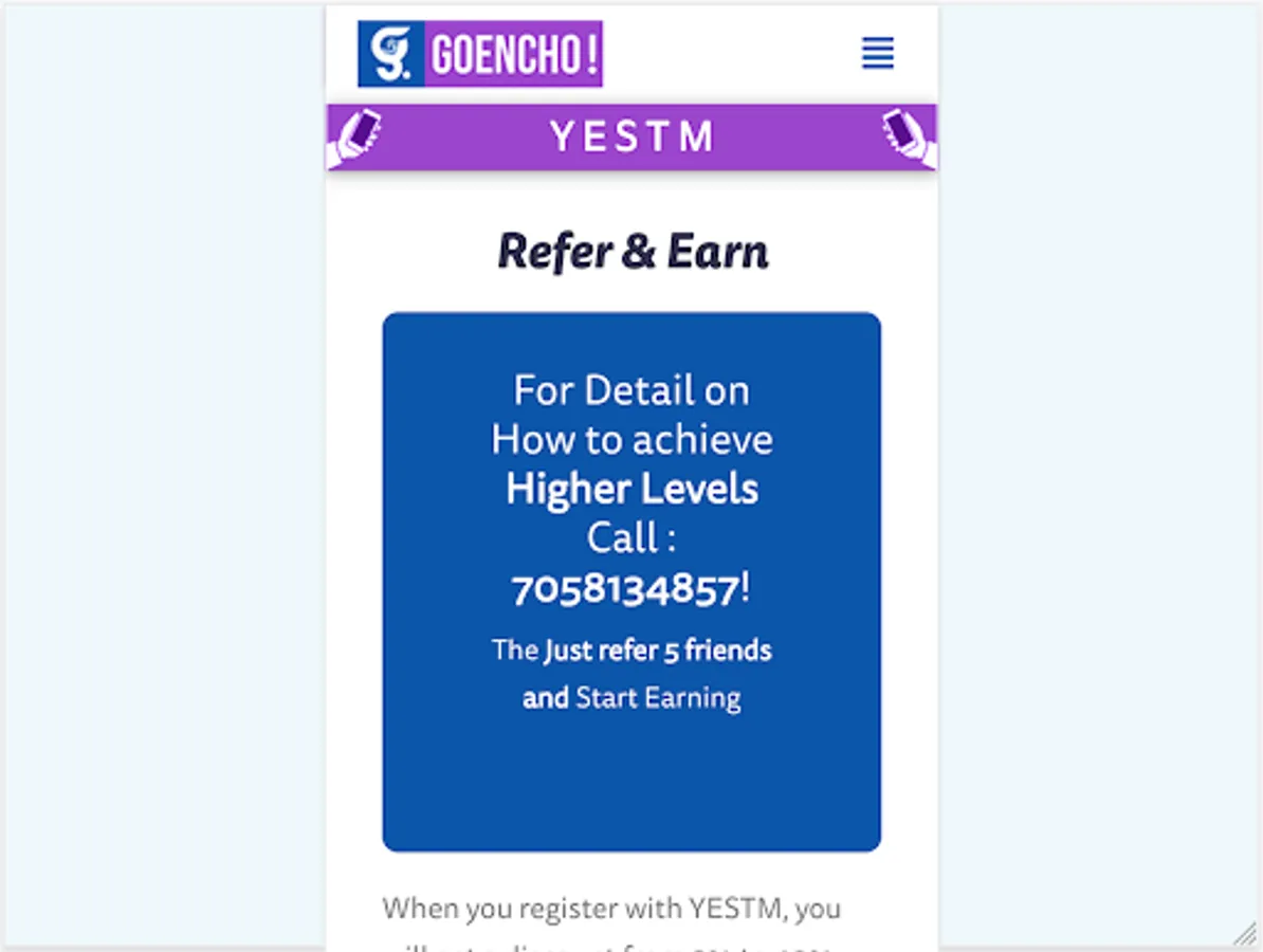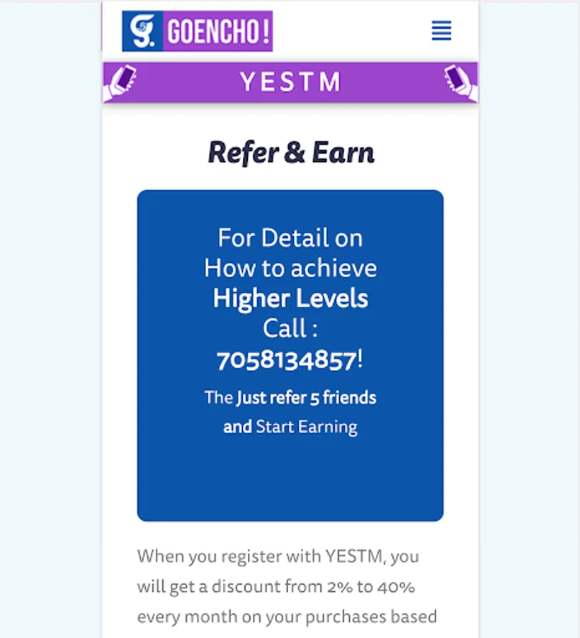 We are currently only serving in Goa. When you register with YESTM, you will get a discount from 2% to 40% every month on your purchases based on your package and level. You will also get Cash Back and many more benefits for referring your friends. We offer Branded & Quality Products of Your Choice.