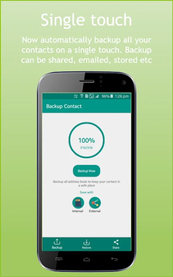 'Contacts Backup' App can create backups of your contacts easily, quickly and safely. Contacts Backup allows you to send information about your contacts as text by email and SD card, that can send a text. Just choose a contact plus specific contact information you wish to share, and simply send it!