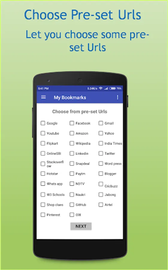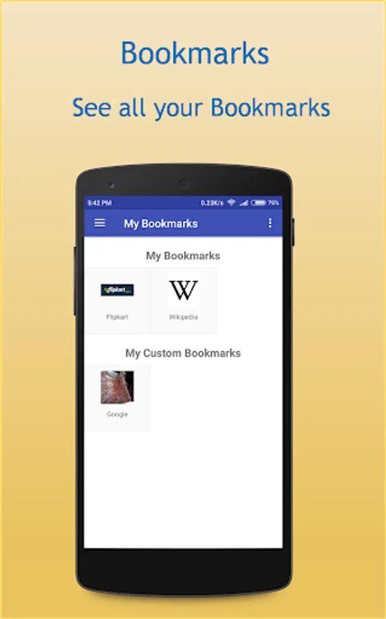 My Bookmarks is the simple app to store and organize your favorite website at one place. It is a free app where you can add your Custom Bookmarks along with some most popular websites. All websites are opened within app only so you don't need any browser to access those websites.