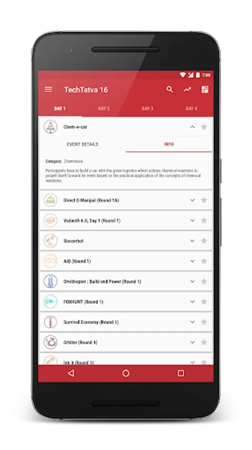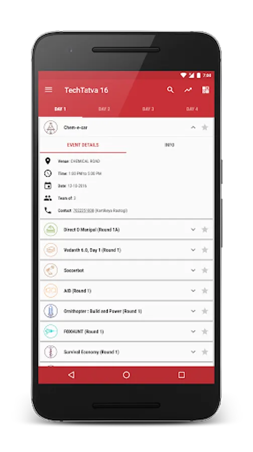 With smooth gestures and sleek transitions, this app gives every detail to the user related to TechTatva. Once downloaded, people can now view the event info while on the go. No internet connection is required once the event data has been cached. Card interface for the events makes it easy for the user to see location, date, timings and contact info. All the events have been categorically listed for an easy search.