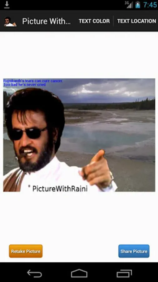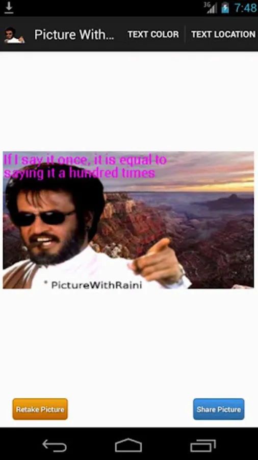 Choose a quote, select an image from your gallery or take a picture and you have your own personal Picture with Rajni.