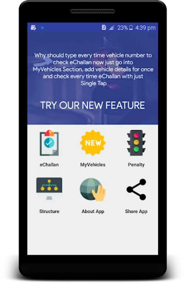 Go to the MyVehicles section, add your vehicle details for once and check eChallan everytime with a click
