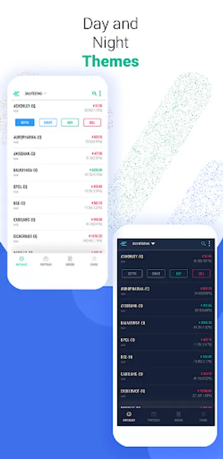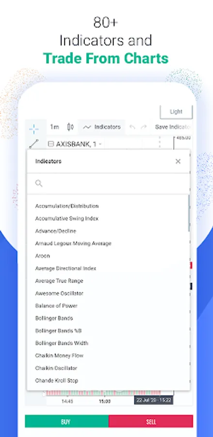 Sophisticated graph analytics: This share market trading app (India) comes with 80+indicators. You can do Trades from Charts too!