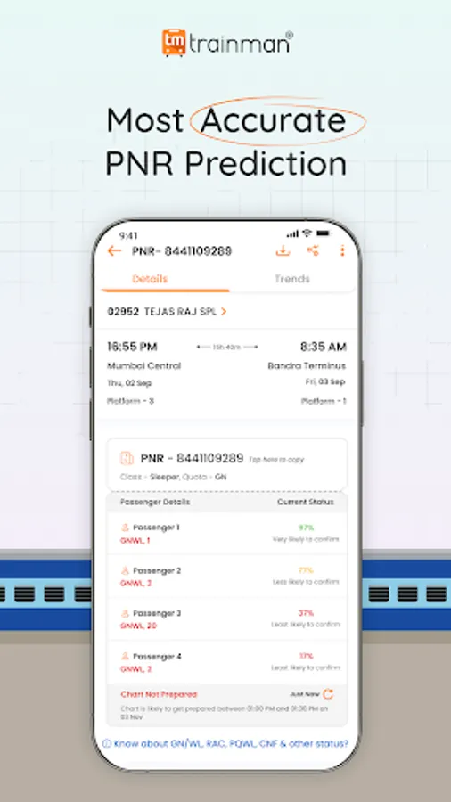- Get the most accurate confirmation chances and Live PNR status prediction for Train Ticket Booking with Trainman.
