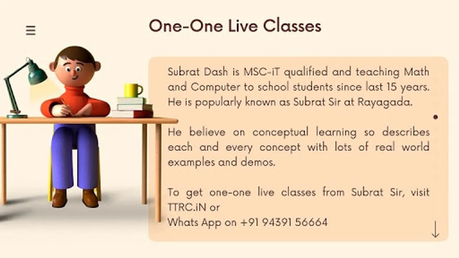 Programming Self Study Python C Java JavaScript is developed by Subrat Sir, the founder of TTRC. TTRC Computer institute provides offline computer education at Rayagada, Odisha, India. TTRC.iN provides online education all over the world. Subrat Sir taught more then 70000 students online and offline. Since last 15 Years he is teaching coding to beginners and school students. The contents of this application is free. If you feel requirement of live classes or pre-recorded video tutorial premium classes with certificate, then visit TTRC.iN or Whats App us.