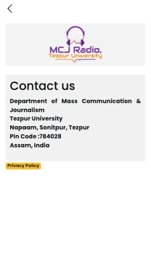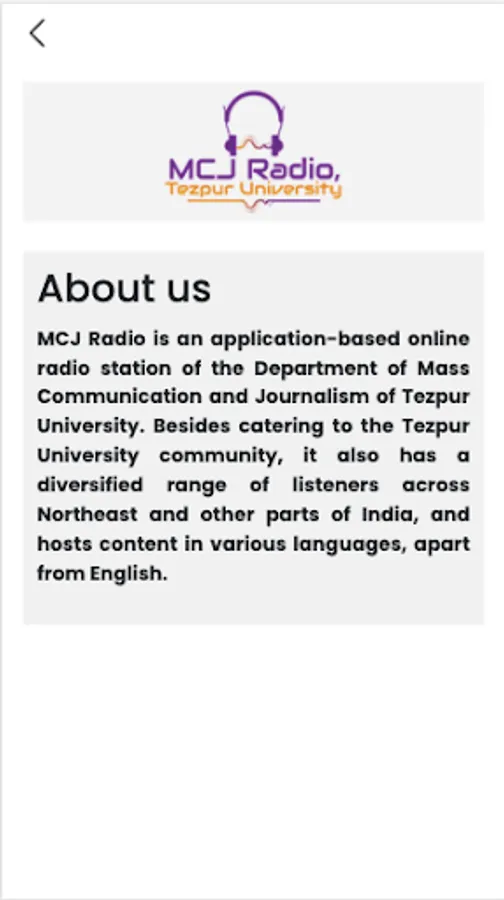 From this Radio App, user can listen all kind resources from the Department of Mass Communication and Journalism, Tezpur Univerisy. For example: songs, discussion etc