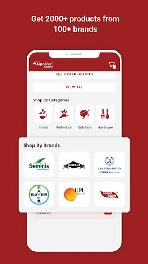 1. An exhaustive catalog with 1000+ products from 250+ best agri brands across all categories of seeds, crop protection, crop nutrition, and farm implements are available on this app. AgroStar Saathi retail partners can search for easy product selection.