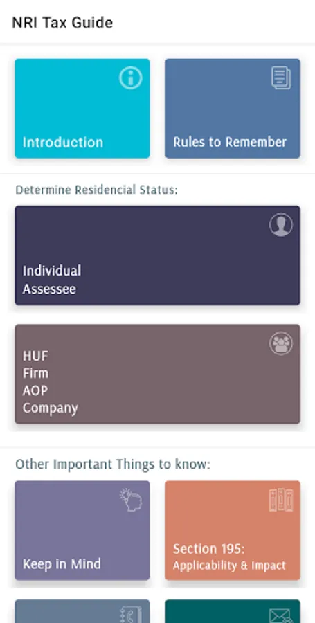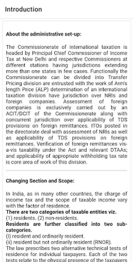 The app helps to Determine Residential Status of Assessee/Individual, HUF/Firm/AOP/Company in a convenient way by Flow Chart.