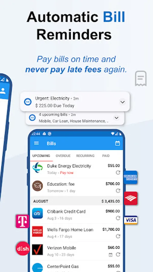 Never miss bills and due dates with our advanced bills manager & cash organizer features. Get smart bill reminders to pay your bills on time, manage subscriptions and avoid paying extra money towards late payment fees or unused subscriptions.