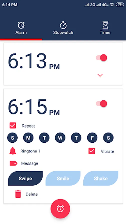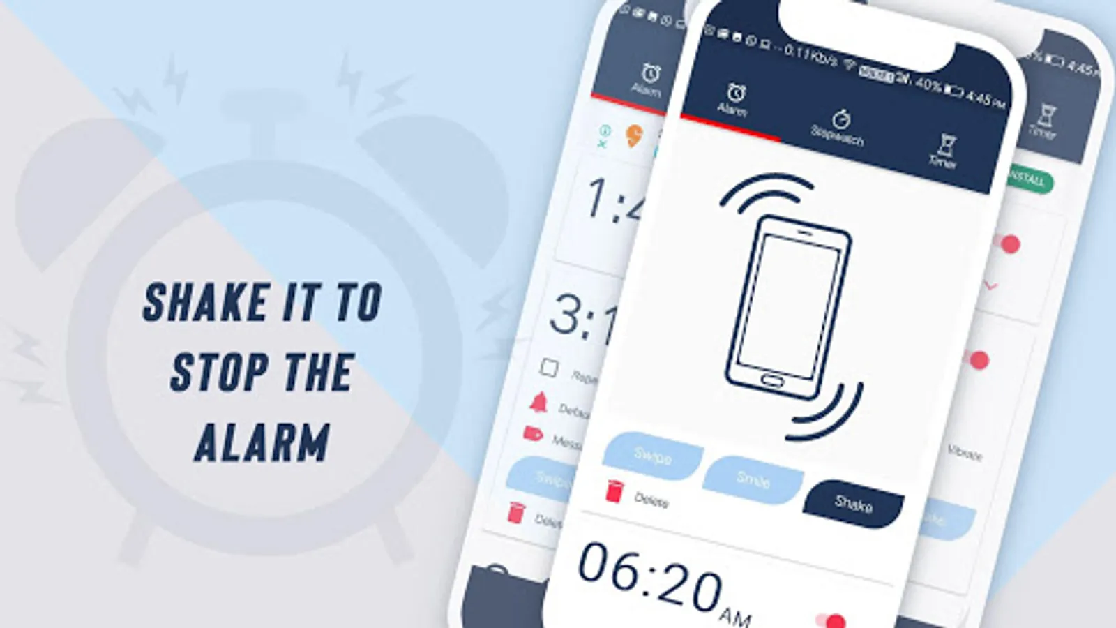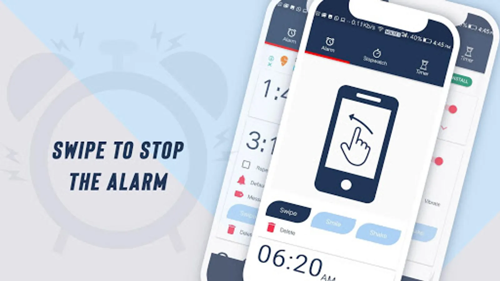Swipe Mode : if you wake easily to alarm sounds, all you need to do is swipe on the screen to stop the alarm.