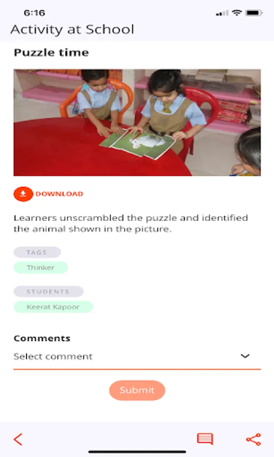 More often than not instances of student achievements and "wow" moments go unrecorded and they hardly ever get witnessed by the parents. The purpose of this app is to facilitate teachers to capture these "wow" moments, in the form of photos, videos, audios and anecdotes, using his/her smartphone and upload them to Lernio. These media get pushed to parents on Lernio on their smartphones in a beautiful engaging timeline view.