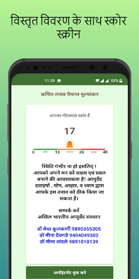 The app includes a questionnaire to calculate your KAP and PSS Score. The app further allows users to book an appointment at All India Institute of Ayurveda, New Delhi for Stress relief related consultation.