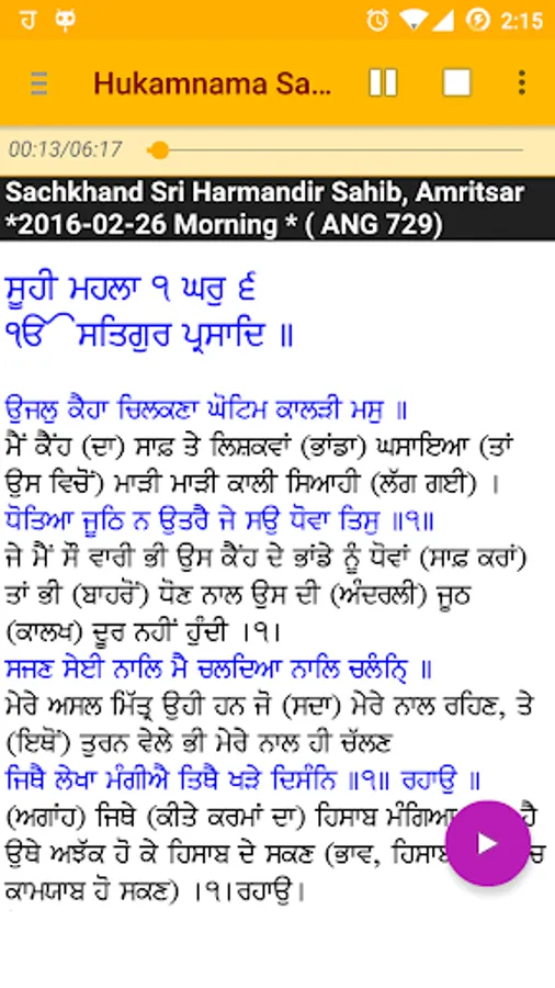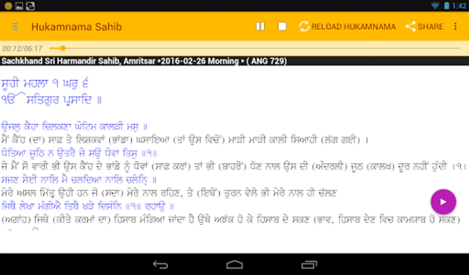 ---- In the current version, user can read today's hukamnama sahib daily from following Gurudwara Sahib. And can listen audio from Sri Harmandir Sahib and from other whenever we are able to get.